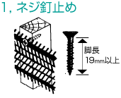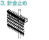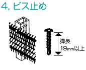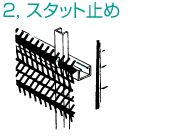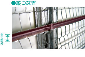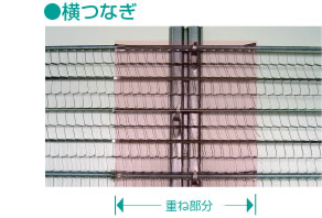 ラインリブは長手方向が下地支柱と直角になるようにし、リブの山側を下地、谷側を手前にして固定します。縦つなぎは、1山重ねにし、横つなぎは、50〜150mm重ねます。重なりは下地支柱の上になるようにして、弛みや浮上がりのないように固定してください。
